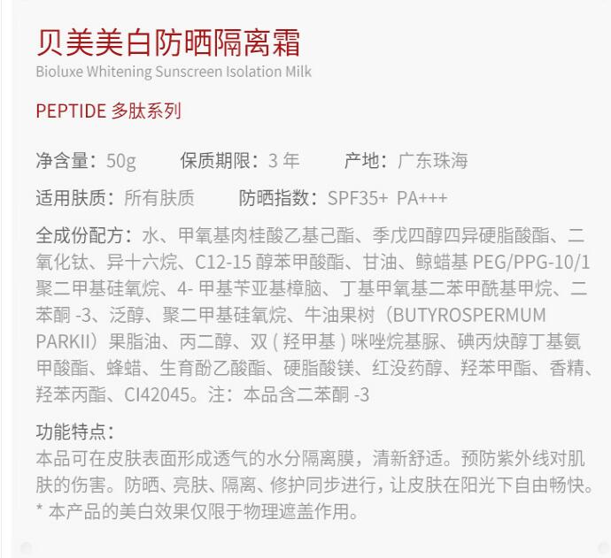 贝美 多肽因子 美白防晒隔离霜 50g SPF35+