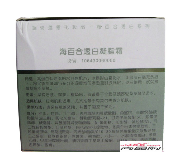 | 产品名称 : | 瑞特莲恩海百合透白凝脂霜(原:乳清滑肤凝脂)50ml |